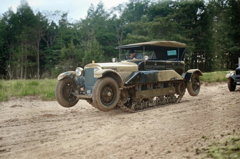 Colonial Office delegates attend a demonstration of battlefield-capable all-terrain vehicles in Aldershot, staged by the War Office. On regular roads, the tracked system raised for stability and performance.