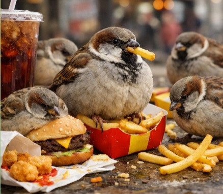Sparrows, once resilient to the challenges of urban living, are now facing the adverse effects of an easy but unhealthy diet. Feeding on fast food near city outlets is contributing to obesity, hormonal disruptions, and reduced reproductive success. While sparrows are adaptable, the long-term consequences of these dietary changes could affect not only individual health but also the future of urban sparrow populations. To ensure the continued success of wildlife in our cities, it is essential to address the environmental factors contributing to these changes, promoting healthier ecosystems for both animals and humans alike.