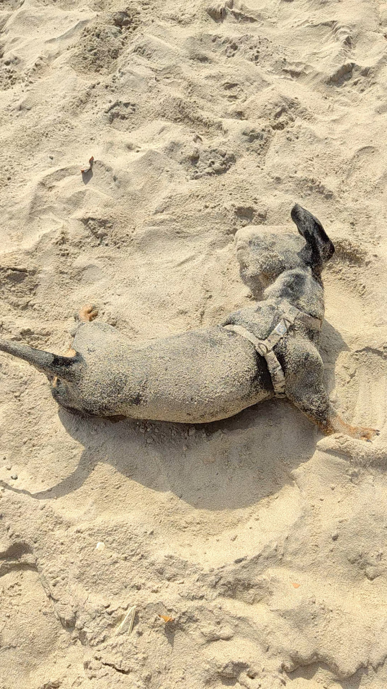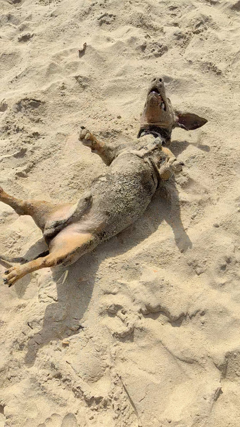 What followed was a display of pure, uninhibited play. Supino began rolling on his back, kicking his legs in the air as if auditioning for a beachside interpretive dance. Sand clung to his wiry fur, coating his belly, his paws, even his floppy ears, until he resembled a furry, sandy snowman. But that didn't slow him down. He'd get up, shake himself off in a shower of sand, and dive right back into his rollicking, tumbling spree, pausing only to lick his chops and take a quick sip of seawater before resuming his beachside antics.