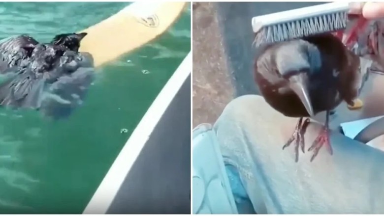 In a heartwarming turn of events, a man stumbled upon a crow in distress while enjoying the great outdoors by a serene pond. This compassionate individual didn't hesitate for a moment and immediately sprang into action to rescue the stranded bird.