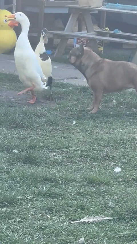 The video opens with Schwein, the French Bulldog, attempting to engage with Muffin, a pristine white duck who appears to be the epitome of indifference. Muffin stands her ground, seemingly unimpressed by the dog's advances, as if to say, "I'm busy, can't you see?" But the tranquility is short-lived when Cookie, a black-and-white duck with a flair for drama, waddles into the frame and decides it's time to turn the tables.