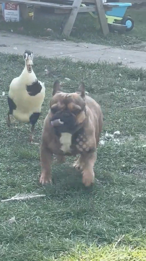 What ensues is a comical chase sequence that could easily be mistaken for a scene from a cartoon. Cookie, with an unexpected burst of speed and determination, begins to chase Schwein around the yard. The dog, initially taken aback, tries to maintain his cool demeanor but can't help but succumb to the duck's relentless pursuit. The roles have reversed, and now it's the duck who's in charge, leading the dog on a merry dance across the grass.