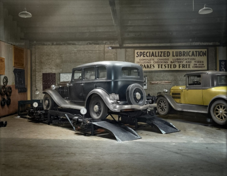 The sedan’s brakes are tested on a Cowdery machine—a complimentary service provided by the garage.