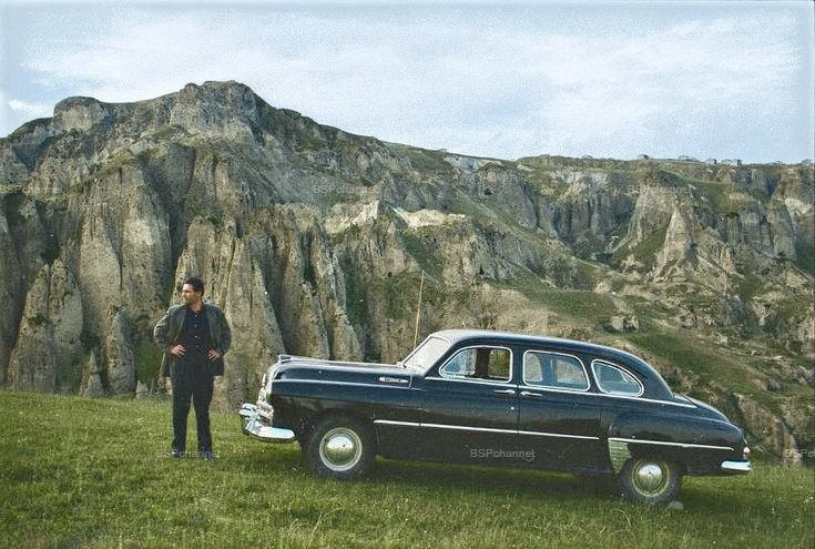 A man beside a GAZ-12 ZiM in the mountains. Armenian SSR, 1960s.